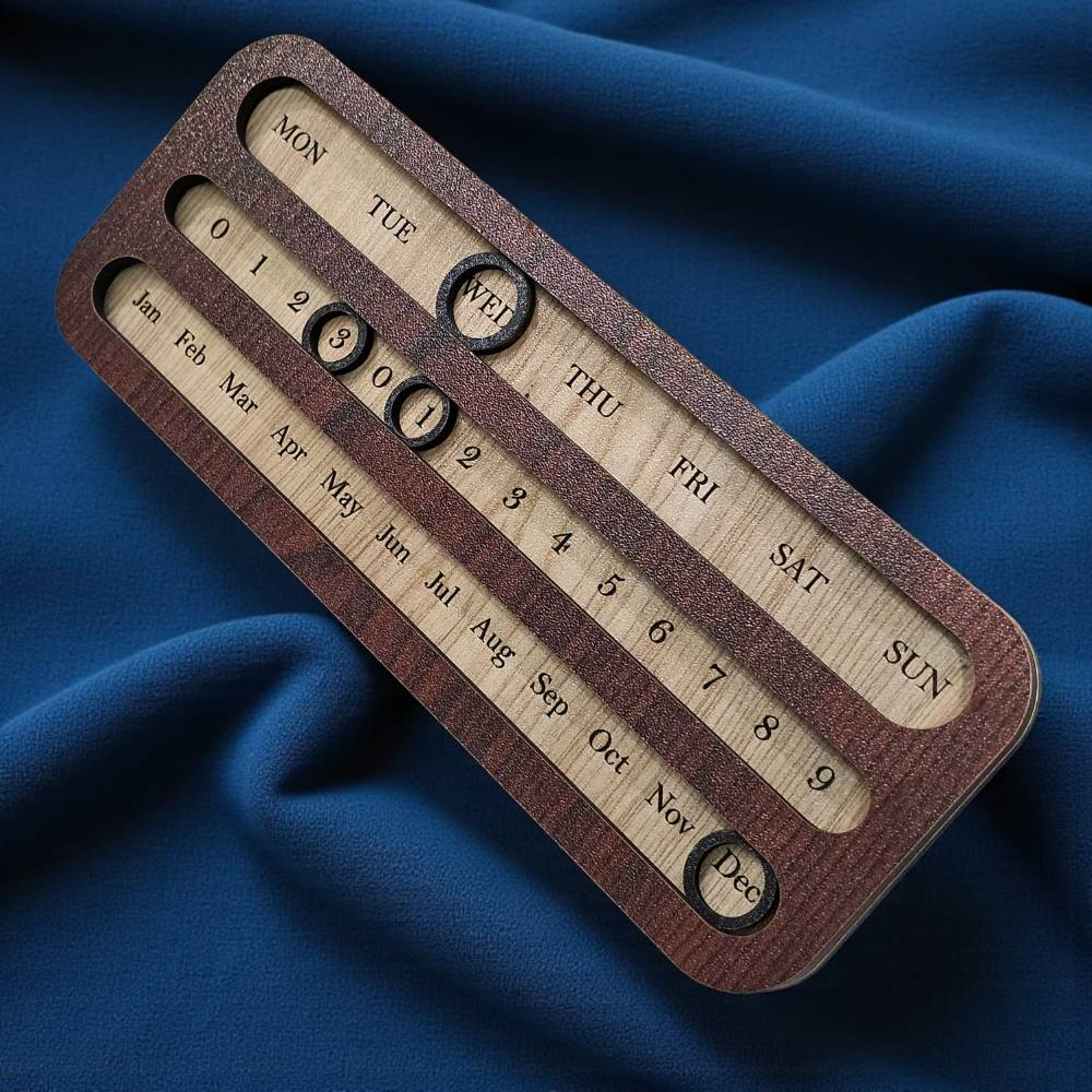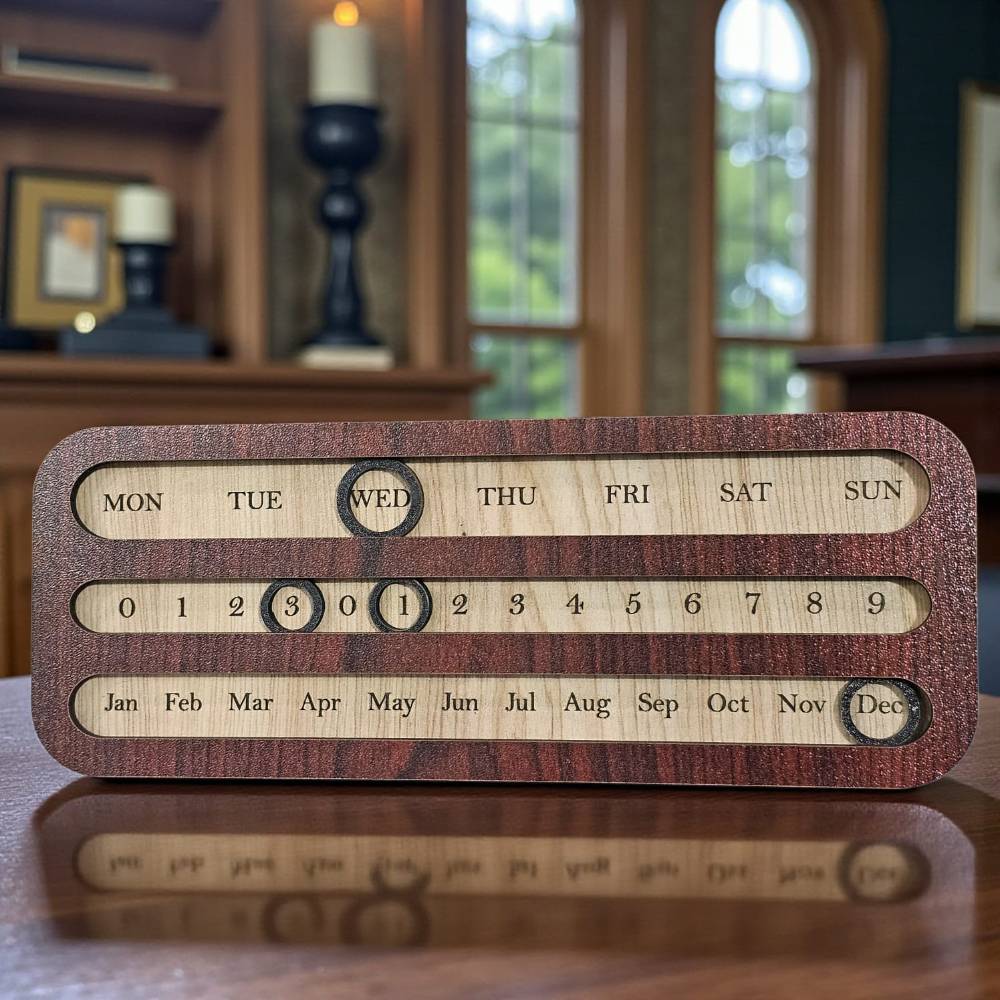 Bring timeless elegance to your workspace with this Handcrafted Wooden Perpetual Desk Calendar. Designed to be used year after year, this calendar features a clean, minimalist layout with smoothly sliding markers for day, date, and month.